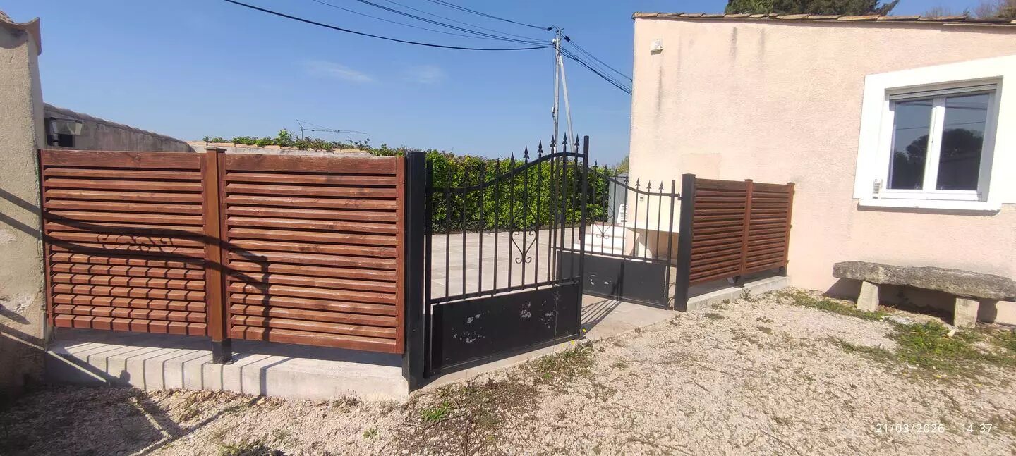 Petite maison individuelle en location à Althen des Paluds de 40m2. Un salon avec cuisine ouverte équipée. Une chambre. Une salle de bain avec douche et toilette. Deux terrasses : une de 15m2 et une autre de 70 m2 en travertin. Un garage en tôle pour stocker maté...