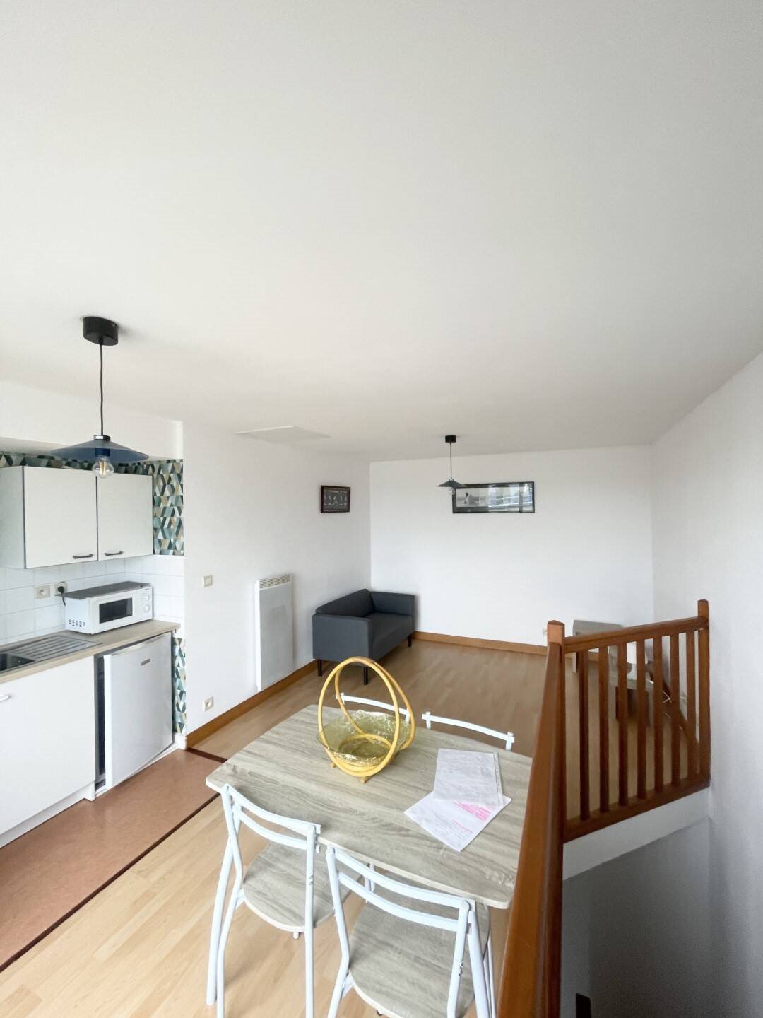 Appartement meublé de Type 2 en plus situé au 38 Bd des Martyrs de la résistance à Coueron, disponible de suite comprenant au premier niveau : un séjour avec coin kitchenette au deuxième niveau : une chambre avec terrasse, salle de bains avec Wc. Terasse orientée Sud. Place de Parking n°23. Chauffage individuel électrique. A proximité des lignes de bus. Si vous souhaitez visiter cet appartement, merci de le Cabinet Puget