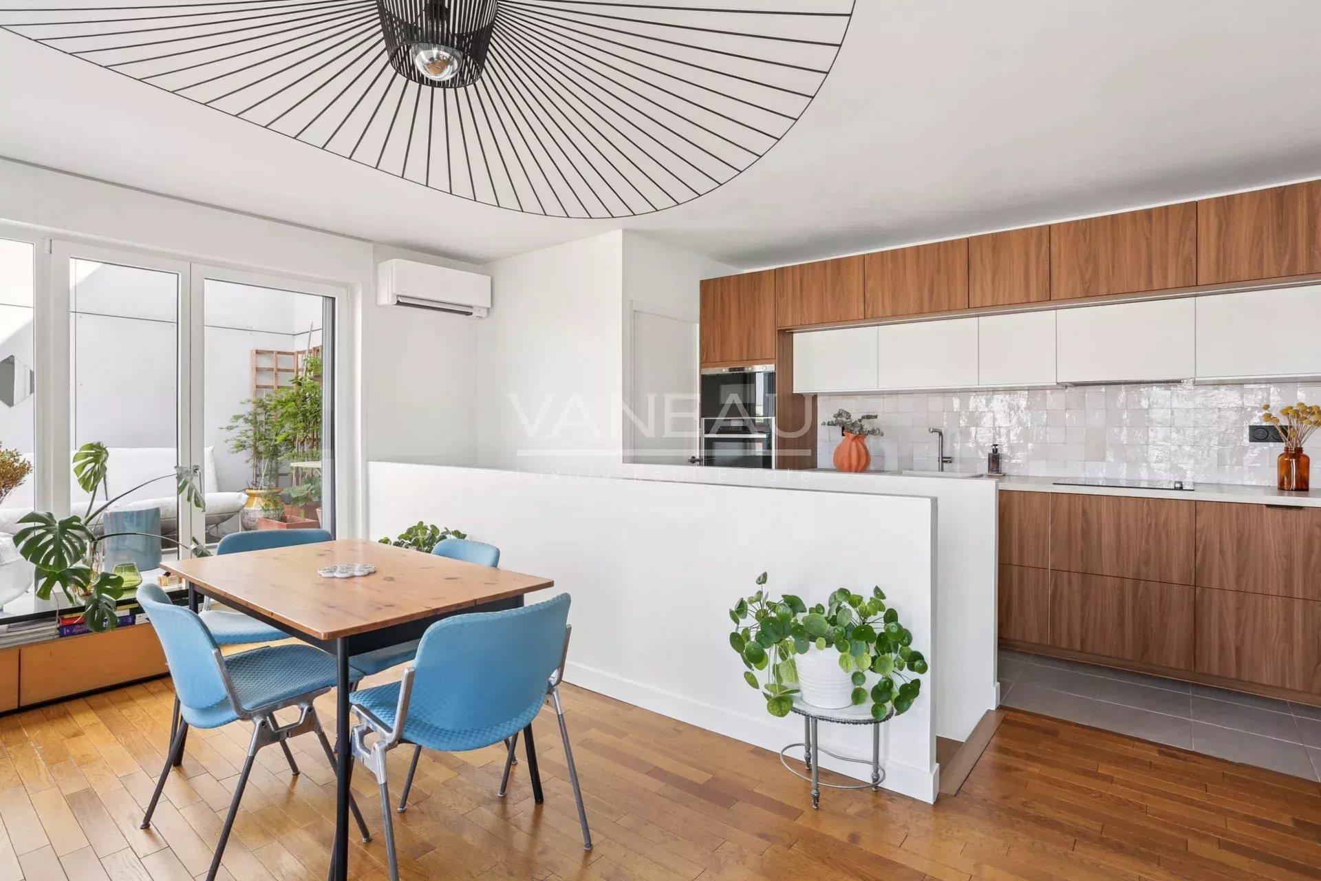 Boulogne, dans l’écoquartier des Rives de Seine, découvrez ce duplex, d'une superficie de 52,02m² Carrez, niché au 9e et dernier étage d’une résidence récente avec ascenseur, sécurisée et parfaitement entretenue. Le premier niveau offre une entrée, une belle chambre avec nombreux placards intégrés ainsi qu’une salle de bains avec Wc. À l’étage, un espace de vie baigné de lumière accueille une cuisine ouverte entièrement rénovée en 2025, donnant sur un séjour chaleureux prolongé par une terrasse de plain pied d’environ 9 m² et d'une buanderie. Vous serez séduit par le calme absolu sur le jardin et l’absence de vis-à-vis. En parfait état, cet appartement coup de cœur bénéficie de prestations de qualité : nombreux rangements, climatisation, extérieur optimisé avec rangement et local à vélos. Vendu avec une place de parking privative en Sus à 24333 euros. Les honoraires sont à la charge du vendeur. Copropriété de 25 lots d'habitation - Charges annuelles de 3600 euros - Les informations sur les risques auxquels ce bien est exposé sont disponibles sur le site Géorisques : Montant estimé des dépenses annuelles d’énergie: entre 730 € et 1050 € (prix indexés au 1er janvier 2021, 2022 et 2023). Aucune procédure en cours sur les fondements des articles 29-1 A et 29-1 de la loi de 1965 et de l’article L.615-6 du Cch.