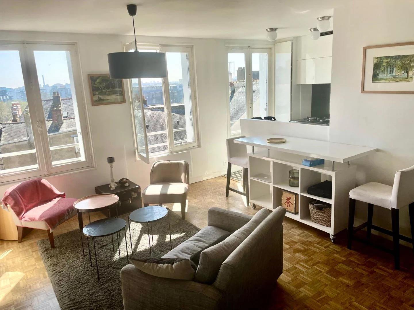 Nantes/Centre Ville A vendre, un appartement lumineux avec vue dégagée exceptionnelle Situé au dernier étage d'une copropriété idéalement placée, cet appartement entièrement rénové séduit par son charme et ses prestations de qualité. Traversant et baigné de lumière, il offre une pièce de vie chaleureuse avec poêle et bibliothèque, ouverte sur une cuisine moderne, meublée et équipée. Il dispose de deux chambres dont une avec penderie intégrée. Les matériaux choisis sont de très belle qualité. Une cave vient compléter ce bien rare. Coup de coeur assuré pour sa vue imprenable, exposée plein sud, et son atmosphère élégante et conviviale. (6.00 % honoraires Ttc à la charge de l'acquéreur.) Copropriété de 16 lots (Pas de procédure en cours). Charges annuelles : 1120 euros.
